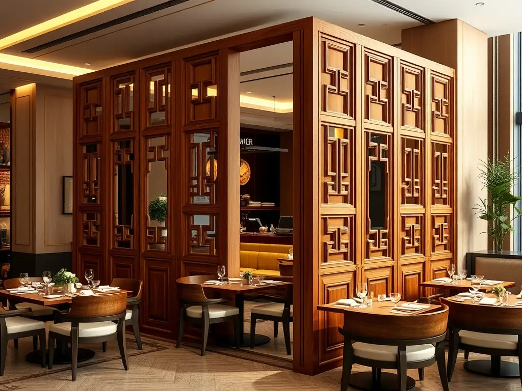 پارتیشن چوبی مدرن جلوهای لوکس و مدرن به محیط میبخشد و تصویر مثبت از هتل یا رستوران ایجاد میکند.